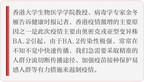 香港大学生物医学学院教授病毒学专家金冬雁告诉记者,香港疫情激增的主要原因之一是此次疫情主要系奥密克戎亚型变异株BA.2引起,BA.2传染性极强,常常在不知不觉中快速传播。有研究显示,奥密克戎的亚型毒株BA.2的传播性可能达到原始奥密克戎毒株的1.5~2倍。