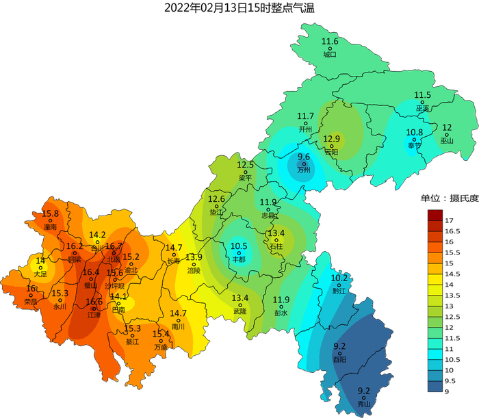 13日夜间到14日白天,各地多云到晴,坪坝河谷地区早上有雾。气温-1~18℃。中心城区:晴间多云,气温5~17℃。