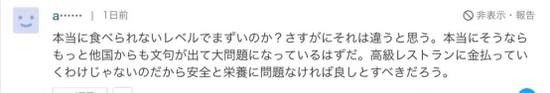 “真的难吃到没法吃的地步吗?我想应该不会到那种地步吧。如果真是那样那别的国家也会有人批评。这不是高级餐厅,在安全和营养方面没问题就行。”