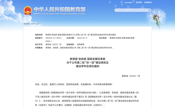 根据国务院《统筹推进世界一流大学和一流学科建设总体方案》,以及教育部、财政部、国家发展改革委《关于深入推进世界一流大学和一流学科建设的若干意见》和《统筹推进世界一流大学和一流学科建设实施办法(暂行)》,经专家委员会认定,教育部等三部委研究并报国务院批准,公布第二轮“双一流”建设高校及建设学科名单。