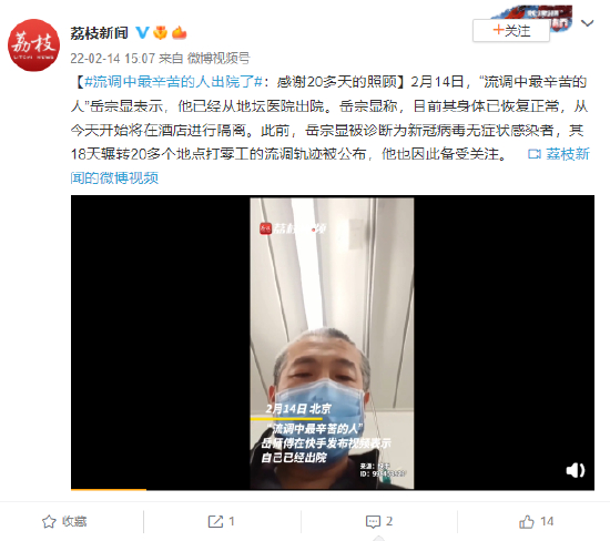 2月14日,“流调中最辛苦的人”岳宗显表示,他已经从地坛医院出院。岳宗显称,目前其身体已恢复正常,从今天开始将在酒店进行隔离。此前,岳宗显被诊断为新冠病毒无症状感染者,其18天辗转20多个地点打零工的流调轨迹被公布,他也因此备受关注。