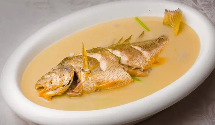 “雪里蕻”是宁波一带每家常备之菜,当地有句老话:“三天勿喝咸菜(即雪里蕻)汤,两脚有点酸汪汪。”黄鱼鱼体肥壮,肉质结实,汤汁乳白浓醇,口味鲜咸合一。