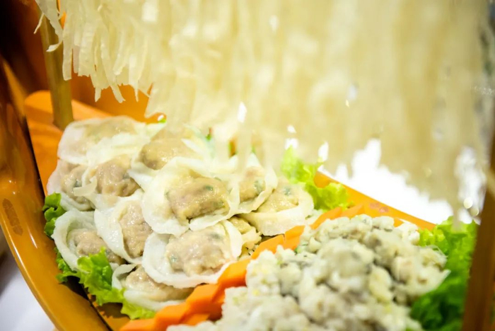 三丝敲鱼是温州民间传统佳肴,相传已有百余年历史。逢年过节、亲朋相聚,常以敲鱼款待客人,“三丝”指的是鸡脯丝、火腿丝、香菇丝,三丝加清汤烹制而成的“三丝敲鱼”,汤清味醇、鲜嫩爽滑,色泽调和,独具风味。
