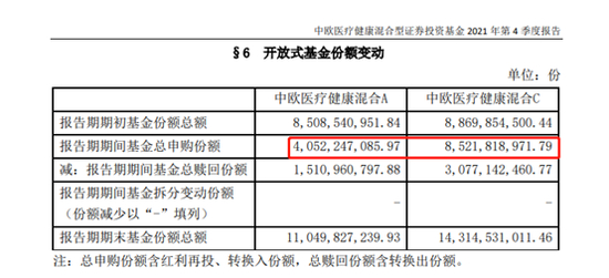 数据显示,去年四季度期间,基民申购中欧医疗健康混合A类份额达40.52亿份,赎回15.11亿份,合计净申购25.41亿份,期末基金份额总额达110.5亿份。