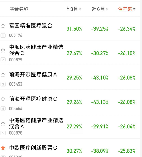 不难发现,这些领跌市场的基金多为主题型产品,基本占据跌幅榜前列。其中聚焦医疗、医药板块的基金损失最为惨重。富国精准医疗以26.34%的跌幅成为年内净值下跌最多的主动权益基金,该基金长期重仓持有生物医药板块个股。中海医药健康产业A、中欧医疗创新A、广发医药健康A等多只医药主题基金同样跌幅较大。齐齐跌超20%。