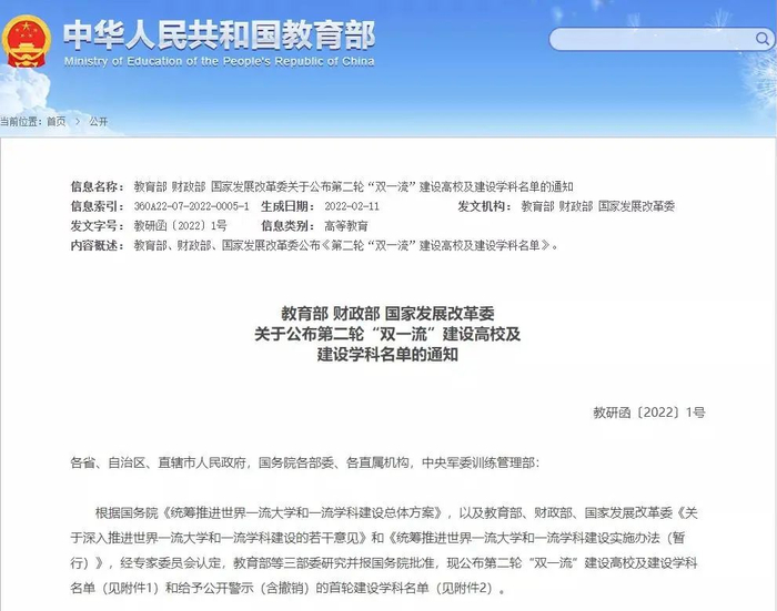 2月14日,教育部官网发布《教育部 财政部 国家发展改革委关于公布第二轮“双一流”建设高校及建设学科名单的通知》,公布了第二轮“双一流”建设高校及建设学科名单和给予公开警示(含撤销)的首轮建设学科名单。重庆大学入选第二轮“双一流”建设高校,机械工程、电气工程、土木工程三个学科入选第二轮“双一流”建设学科。