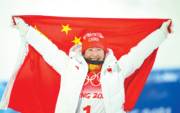 “做到了!我们赢了!”2月14日晚上,北京2022年冬奥会张家口赛区云顶滑雪公园,当美国选手考德威尔的成绩公布,徐梦桃身披国旗热泪盈眶、忘情怒吼。顶着巨大的压力,第四次参加冬奥会的她以108.61分的成绩问鼎自由式滑雪女子空中技巧冠军。这是本届冬奥会中国队获得的第五块金牌,追平了2010年温哥华冬奥会创造的历史最佳纪录。