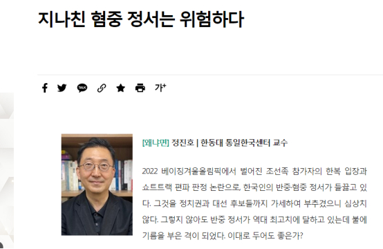 “(韩国国内)过度的反华情绪很危险,”《韩民族日报》14日刊登了韩东大学统一韩国中心教授郑镇镐(音) 以此为题的文章。文章称,北京冬奥引发的“争议”点燃韩国民众的反华情绪,连政治圈和总统候选人也参与其中,这真是非同寻常。他质问:“韩国民众反华情绪达已达到历史最高点,这无异于火上浇油。就这样坐视不管吗?”