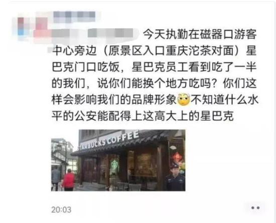 网传截图显示,星巴克员工看到在门口吃饭的民警,称其“会影响品牌形象”,便对民警进行劝离并投诉。