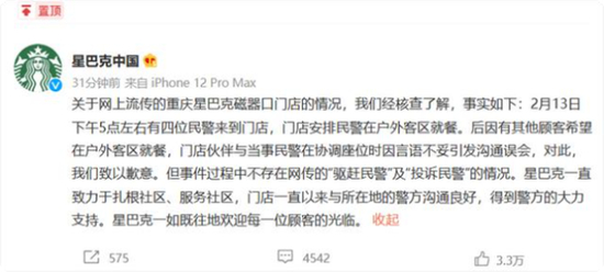 2月14日下午6点20分许,@星巴克中国发布声明称,关于网上流传的重庆星巴克磁器口门店的情况,我们经核查了解,事实如下:2月13日下午5点左右有四位民警来到门店,门店安排民警在户外客区就餐。后因有其他顾客希望在户外客区就餐,门店伙伴与当事民警在协调座位时因言语不妥引发沟通误会,对此,我们致以歉意。但事件过程中不存在网传的“驱赶民警”及“投诉民警”的情况。星巴克一直致力于扎根社区、服务社区,门店一直以来与所在地的警方沟通良好,得到警方的大力支持。星巴克一如既往地欢迎每一位顾客的光临。