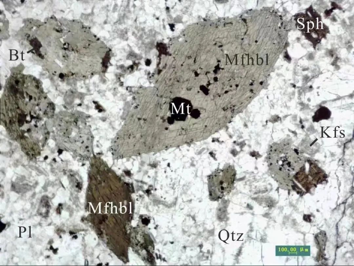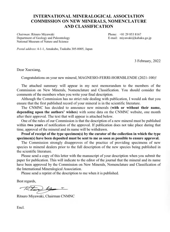 经国际矿物学协会新矿物命名与分类委员会(IMA-CNMNC)审查与投票,我校章永梅副教授、顾雪祥教授与核工业地质研究院范光研究员和李婷研究员等申报的新矿物正式获得批准,编号为IMA2021-100。该新矿物被命名为“Magnesio-ferri-hornblende”,中文名为“镁高铁角闪石”,缩写名为Mfhbl。