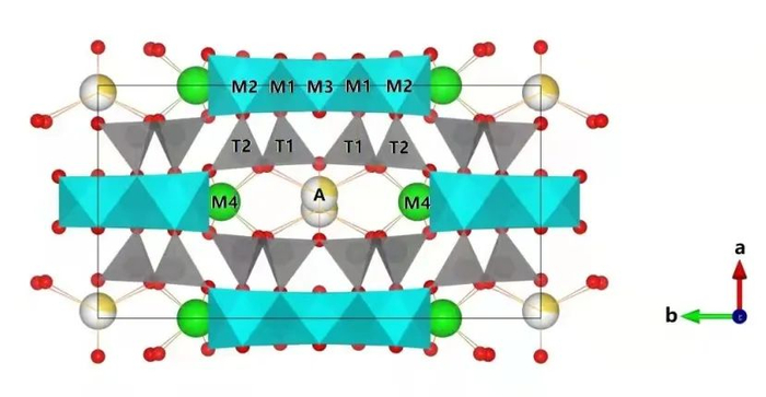 角闪石是造岩矿物中一种重要的超族矿物,迄今人类认知并得到国际矿物协会新矿物命名及分类委员会认可的角闪石矿物种数量已超过100个,但在这些角闪石超族矿物种成员中,由我国学者发现的寥寥无几。作为火成岩中常见的硅酸盐矿物,角闪石的结构和化学组成对揭示岩浆起源演化、岩石成因、成岩物理化学条件以及岩体含矿性评价等方面具有十分重要的标识作用。新发现的镁高铁角闪石属钙质角闪石,晶体化学式为Ca2(Mg4Fe3+)[(Si7Al)O22](OH)2,单斜晶系,空间群C2/m,晶胞参数a = 9.8620(3), b = 18.1060(5), c = 5.3081(1) Å, β =104.848(1)°。