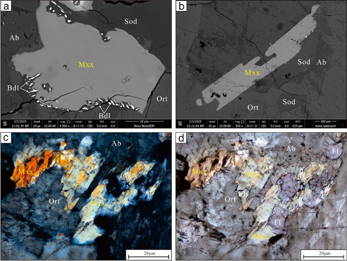 莫片榍石及其共生矿物特征. a和b为BSE图像;c为正交偏光;d为单偏光