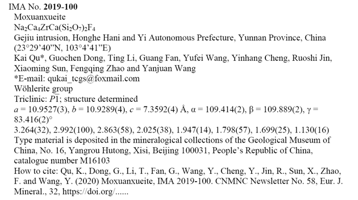第一个矿物是Moxuanxueite,中文名为莫片榍石,命名号为IMA No.2019-100。矿物宏观显淡黄色,单偏光下呈无色,正交偏光下I级灰白-浅黄干涉色,玻璃光泽,白色条痕,计算密度3.231g/cm3,与斜锆石、方钠石、正长石、钠长石、硅灰石、黑榴石、氟硅磷灰石、氟铈硅磷灰石和磁铁矿等共生。