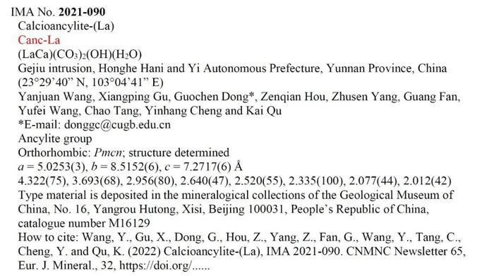 钙碳镧矿IMA-CNMNC批准文件与新矿物通讯信息