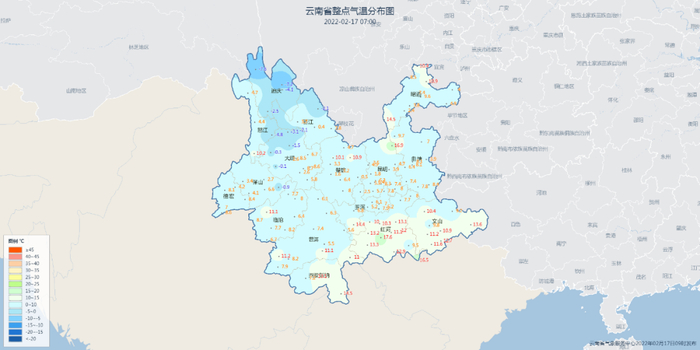 不过,在晴朗天气之下,由于晴空辐射降温的影响,云南中部以北、西北部一线清晨气温偏低,迪庆、丽江北部、大理中北部今早7时气温在0℃以下,易出现霜或霜冻天气,可能给农作物带来的不利影响。