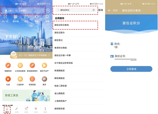 实名登录“随申办市民云”APP→首页搜索关键字“居住证积分”→点击“居住证积分查询”进入服务页面