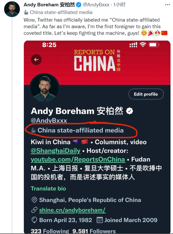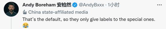 然而,安柏然今日(19日)惊讶发现,自己被推特贴了个标签:“wow,推特官方给我贴上了‘中国官方媒体’的标签。据我所知,我是第一个获得这一令人垂涎头衔的外国人。让我们继续与机器战斗吧,伙计们!”↓推文后还附上代表愉快、庆祝以及中国国旗的表情符号。