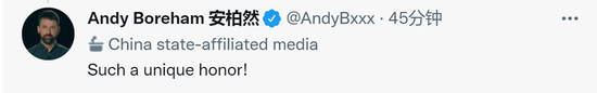 安柏然回复称,“我觉得这是因为我最近与一些外国记者和澳大利亚战略政策研究所有过争执,他们可能多次报道过我的账号,试图让我被贴上标签。说实话,如果这不限制我使用,我很荣幸能获得这一头衔。”↓