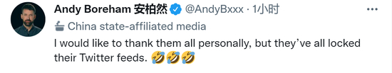 来自英国的大卫·弗格森是中国外文局外文出版社资深翻译改稿专家,他也在安柏然这条推文下评论,“该死的。我实际上才是中国官方媒体,我却没有那个令人垂涎的头衔。不过,我想这是你辛苦工作换来的。恭喜,兄弟……”↓