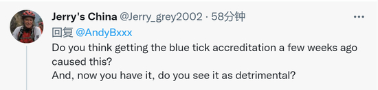 有网友问:“你认为,是几周前获得的蓝勾认证导致了这一切吗?现在你有了(这一标签),你认为它是否是有害的?”↓