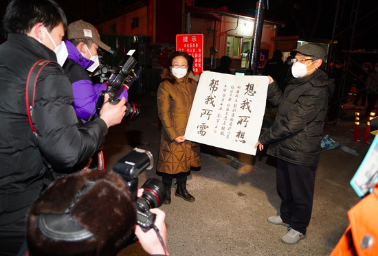 暮色中,安贞里门前的铁质围挡被拆除。等待许久的居民走出家门,互道珍重、互相庆贺,大家携手渡过了这一段特殊的日子。居民刘学芬把一幅书法作品送给安贞街道和安贞里社区居委会,感谢他们的付出。
