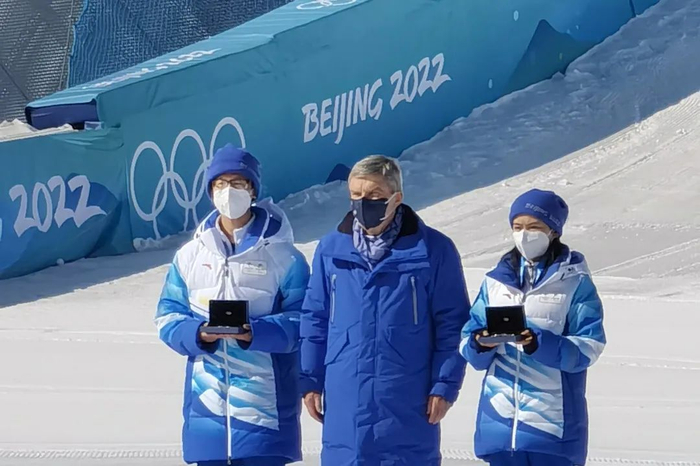 2月21日,江海霞(右一)在国际奥委会答谢仪式上作为优秀志愿者代表接受巴赫主席的礼物