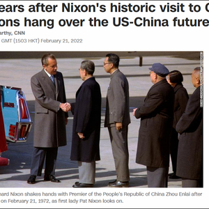 “尼克松对中国进行历史性访问50年后,问题笼罩着美中未来”,美国有线电视新闻网(CNN)21日以此为题称,尼克松历史性访问的50周年纪念正值中美关系的低谷。“华盛顿的许多人现在将中国视为一个日益增长的经济和军事威胁,紧张的关系缩小了合作的余地。”