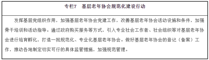促进老年人社会参与。在全社会倡导积极老龄观,引导老年人根据自身情况,积极参与家庭、社区和社会发展。积极开展“银龄行动”,支持老年人参与文明实践、公益慈善、志愿服务、科教文卫等事业。建设高层次老年人才智库,在调查研究、咨询建言等方面发挥作用。鼓励和引导老年人在城乡社区建立基层老年协会等基层老年社会组织,搭建自我服务、自我管理、自我教育平台。指导和促进基层老年社会组织规范化建设。
