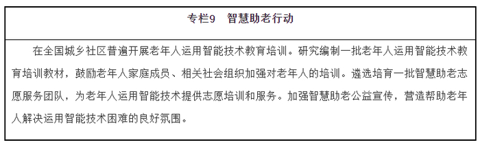 推进智能化服务适应老年人需求。依托全国一体化政务服务平台,推进政务数据共享,优化线上线下政务服务,让老年人办事少跑腿。持续推进互联网网站、移动互联网应用适老化改造,优化界面交互、内容朗读、操作提示、语音辅助等功能,鼓励企业提供相关应用的“关怀模式”、“长辈模式”,将无障碍改造纳入日常更新维护。支持终端设备制造商、应用产品提供商、养老服务机构联动,促进上下游功能衔接。以市场力量为主体推动出台一批智能技术适老化改造标准。组织开展老年人运用智能技术教育培训,通过体验学习、尝试应用、经验交流、互助帮扶等,引导老年人了解新事物、体验新科技、运用新技术。严厉打击电信网络诈骗等违法犯罪行为。