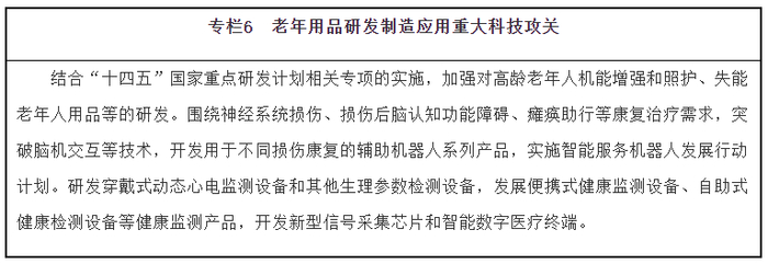 强化老年用品的科技支撑。加快推进互联网、大数据、人工智能、第五代移动通信(5G)等信息技术和智能硬件在老年用品领域的深度应用。支持智能交互、智能操作、多机协作等关键技术研发,提升康复辅助器具、健康监测产品、养老监护装置、家庭服务机器人、日用辅助用品等适老产品的智能水平、实用性和安全性,开展家庭、社区、机构等多场景的试点试用。