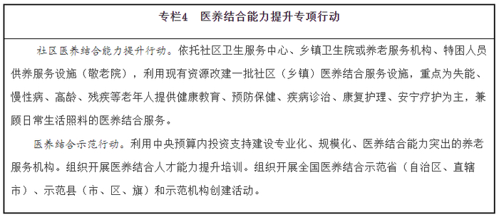 增加医养结合服务供给。实施社区医养结合能力提升行动。积极开展基本公共卫生服务老年健康与医养结合服务项目。支持优抚医院、光荣院转型,开展医养结合服务。推动社区卫生服务中心与社区养老服务机构、乡镇卫生院与特困人员供养服务设施(敬老院)、村卫生室与农村幸福院毗邻建设,采取多种有效方式实现资源整合、服务衔接。