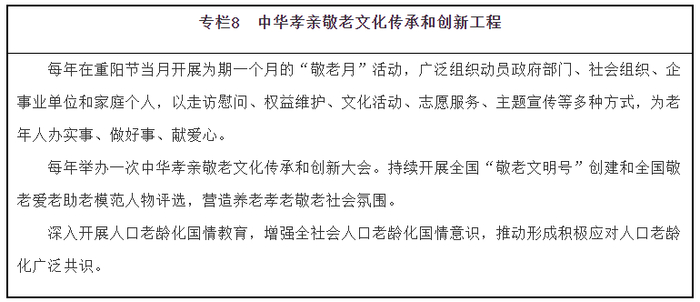 《规划》部署了9方面具体工作任务,包括织牢社会保障和兜底性养老服务网,扩大普惠型养老服务覆盖面,强化居家社区养老服务能力,完善老年健康支撑体系,大力发展银发经济,践行积极老龄观,营造老年友好型社会环境,增强发展要素支撑体系,维护老年人合法权益。