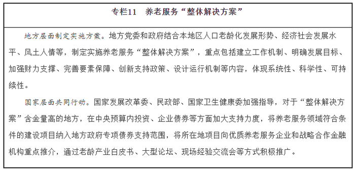 各省(自治区、直辖市)要根据人口老龄化发展形势,制定实施专项规划,加强与相关规划衔接。各级老龄工作委员会要发挥统筹协调作用,推动老龄工作委员会各成员单位履职尽责,形成工作合力。发挥养老服务联席会议制度作用,推进养老服务体系建设,强化区域养老服务资源统筹管理。支持城市群、都市圈打造养老服务体系一体化建设格局,形成服务能力衔接、产业发展协同的合作区域。支持大型城市和区域中心城市推动养老产业集聚发展,充分发挥辐射带动和示范作用。推动以地级行政区为单位制定“整体解决方案”,将老龄事业发展和养老服务体系建设纳入经济社会发展全局中通盘考虑,全方位整合资源力量,充分调动各方积极性,推动兜底性、普惠型、多样化三种路径协同发展。