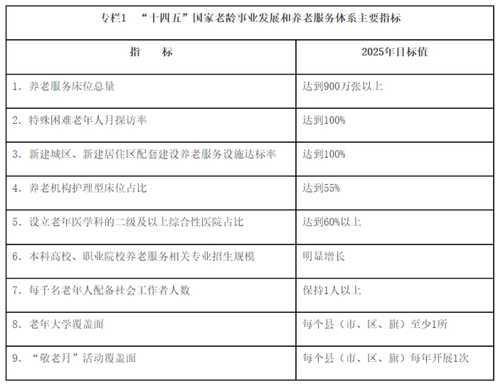“十四五”时期,积极应对人口老龄化国家战略的制度框架基本建立,老龄事业和产业有效协同、高质量发展,居家社区机构相协调、医养康养相结合的养老服务体系和健康支撑体系加快健全,全社会积极应对人口老龄化格局初步形成,老年人获得感、幸福感、安全感显著提升。