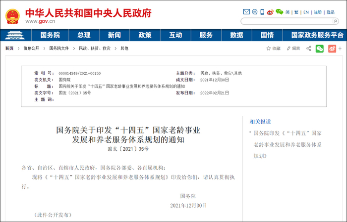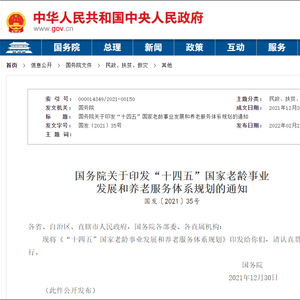 据中国政府网2月21日消息,国务院印发《“十四五”国家老龄事业发展和养老服务体系规划》(以下简称《规划》)。