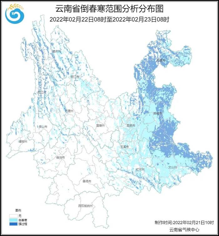 2月22日08时-23日08时:倒春寒影响范围将进一步向西向南扩大,强度增强,滇西北、滇西北部、滇东北、滇东和滇东南东部地区将出现强倒春寒。
