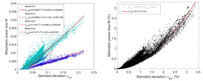 由于地面上组件自阴影的存在,双面光伏组件背表面上的辐照均匀性不同。一般条件下,单块组件由于背面不均匀辐照导致的失配损失很少,但在评估双面光伏阵列真实性能或辐照资源丰富时,这部分损失需要考虑。传统的电池级电气模型(详尽计算模型)并不能适用于双面组件发电性能的快速评估。为了解决这一难题,白建波教授团队研究通过将背面发电失配损失(Mismatch Loss)参数化,定义成总辐照度变化(标准偏差σ)的函数,重新建立了方程,从而间接地考虑地面阴影影响。一旦求得每片电池或者特征电池的受光量时,便可以通过简化方程直接得出损失功率,绕过电气模型,高效地实现了双面组件发电性能的快速评估。