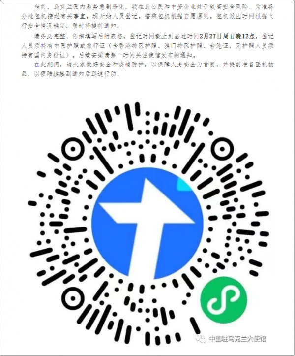 乌克兰国内局势急剧恶化,我在乌公民和中资企业处于较高安全风险。为准备分批包机接返有关事宜,现开始人员登记。搭乘包机根据自愿原则。包机派出时间根据飞行安全情况确定,届时将提前通知。“请务必完整、仔细填写后附表格,登记时间截止到当地时间2月27日周日晚12点,登记人员须持有中国护照或旅行证(含香港特区护照、澳门特区护照、台胞证,无护照人员须持有国内身份证)。后续安排请第一时间关注使馆发布的通知。”