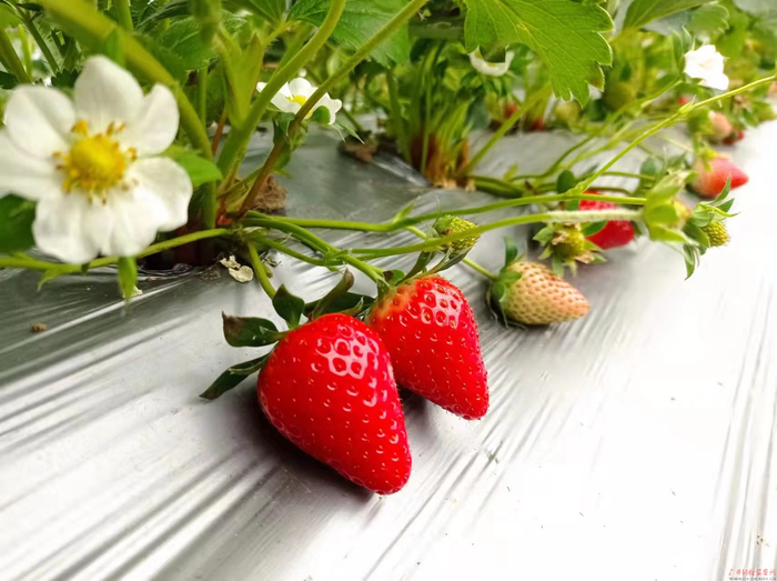 借助脱贫攻坚以来的各项政策资金扶持,依托村委“基地+合作社+农户”的产业发展模式,2年前,韦雪萍和丈夫何建达把准时机,在本村创办起了种植专业合作社,而草莓也是他们发展的种植产业之一。通过流转土地,韦雪萍夫妇积极带动当地6户脱贫户共同发展“红颜”“法兰地”“甜查理”等特色品种草莓,不仅从培育、种植、施肥等方面指导在园里帮忙的脱贫户种植技术,还鼓励周边的农户以入股合作社的方式增加家庭收入。截至目前,韦雪萍夫妇共带动当地发展的草莓面积50多亩,年总产值达400多万元。