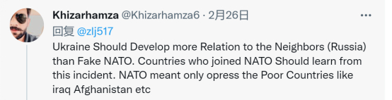 “乌克兰应该更多发展与邻国(俄罗斯)的关系,而不是与虚假的北约(联系)。加入北约的国家应该从中吸取教训。北约只意味着压迫伊拉克、阿富汗等贫穷国家。”