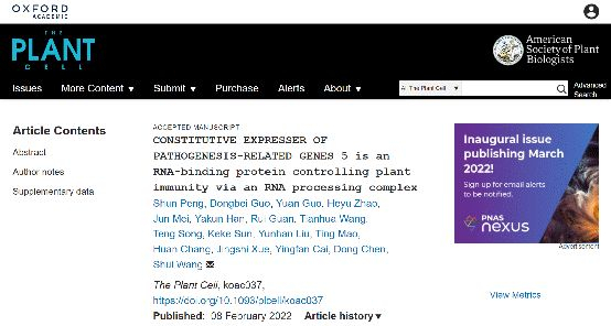我校生命科学学院王水课题组于2月8日在The Plant Cell期刊上发表题为“CONSTITUTIVE EXPRESSER OF PATHOGENESIS-RELATED GENES 5 is an RNA-binding protein controlling plant immunity via an RNA processing complex”研究论文。该论文发现一个RNA结合蛋白CPR5,通过RNA加工复合体调控植物免疫。RNA加工是增加信号分子多样性的一个重要途径。CPR5将RNA加工和植物免疫两大生命基本过程联系起来,为揭示植物免疫可塑性调控的机理奠定理论基础。
