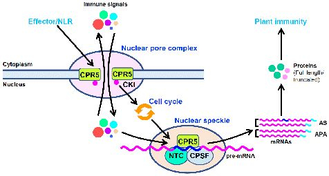 CPR5作为一个RNA结合蛋白,是迄今发现的第一个免疫信号因子,将核质运输、细胞周期和RNA加工三大基本生命过程整合在一起调控植物免疫(见下图)。因此,CPR5突变体将是解析植物ETI信号传递的一个重要遗传工具。