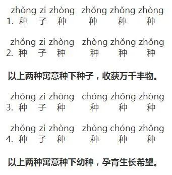 说回咱们的六字上联,“种”字有三个读音,即:一读zhǒng,名词,种子;二读zhòng,动词,播种;三读chóng,形容词,幼稚。根据这三种读音,上联可以划分出两种含义、四种读法: