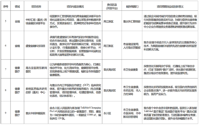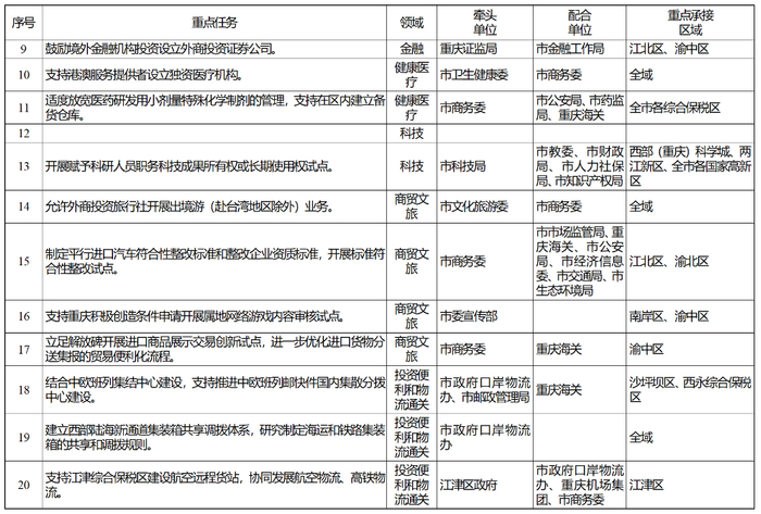 ⑦健康医疗领域,将把符合条件的互联网医疗服务纳入医保报销范围。推动技术、管理先进的港澳独资医疗机构落户重庆。同时,对医药研发的化学制剂管理、仓储等制定了创新举措。