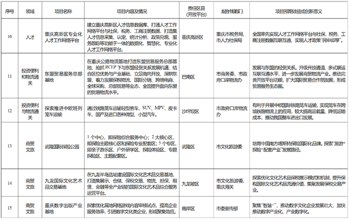 ③投资便利和物流通关领域,重庆将开展中欧班列快件进出口测试,推进中欧班列邮快件国内集散分拨中心建设。同时,将开通江津直发陆海新通道中老铁路国际班列,打造区域性高铁物流集散中心。