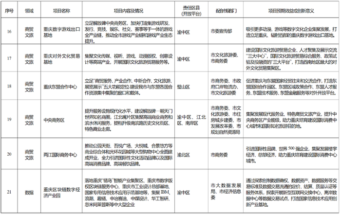 为助力重庆加快建设国际消费中心城市和西部金融中心,本次《重点项目清单》部署24个项目中,商贸文旅和金融领域居多,且充分突出了各区域优势,中心城区、主城新区、渝东北三峡库区城镇群和渝东南武陵山区城镇群入选项目区位特色和产业特色明显。
