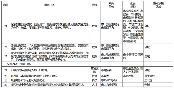 ④数据领域,重庆将加快出台相关文件,探索建立健全数据产权、数据权益、交易流通和安全保护等基础性制度规范,推动数据要素流通法规标准体系建设。围绕西部数据交易中心打造内容丰富、覆盖全面、特色突出的场景化数据交易产品;围绕中新国际数据通道应用,探索开展跨境数据流动试点,建立数据跨境流动安全管理体系。