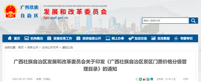 据了解,广西将加强景区门票价格分级管理,并对列入自治区景区门票价格分级管理目录的景区门票价格(含景区内配套交通运输服务价格,下同)实行政府定价或政府指导价管理。