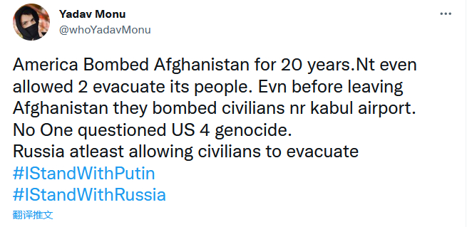 “美国轰炸了阿富汗20年,就连在离开阿富汗之前,他们还轰炸了喀布尔机场的平民,可没有人质疑美国是在种族灭绝。俄罗斯至少还先提醒平民撤离了。”